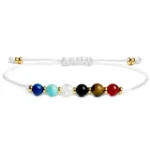 Ta urocza damska bransoletka sznurkowa to celebracja kolorów. Została wykonana z barwnej mieszanki naturalnych kamieni, takich jak lapis lazuli, amazonit, kryształ górski, onyks, tygrysie oko i karneol. Ich żywe barwy pięknie prezentują się na tle nieskazitelnie białego sznurka, a całość przełamana jest blaskiem złotych koralików, tworząc świeży i radosny design.