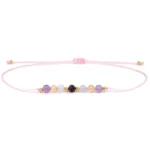 Wyjątkowa damska bransoletka sznurkowa to hołd dla minimalistycznego piękna. Została wykonana z rzędu drobnych 3 mm lśniących, fasetowanych kamieni czterech legendarnych minerałów. Kamienie wzbogacono o subtelne, złote koraliki ze stali chirurgicznej, które nadają całości eleganckiego blasku, a kompozycję osadzono na delikatnym, różowym sznurku.