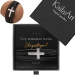 To właśnie na plecionce umieszczony jest solidny krzyż ze stali chirurgicznej, który przyciąga wzrok i nadaje całości głębokiego, duchowego znaczenia.